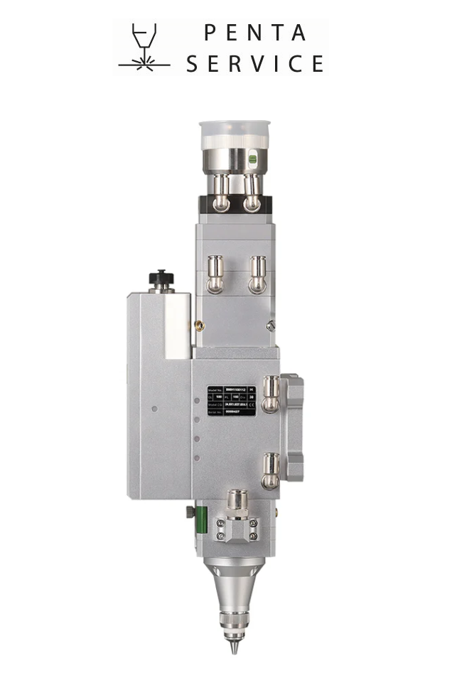 Лазерная головка состоит из четырех основных блоков: коллиматорный модуль, модуль привода фокусирующей линзы, модуль защитной линзы и модуль сопла.- Коллиматорный модуль преобразует расходящийся пучок света, исходящий из оптического волокна, в параллельный лазерный луч, который выходит через центр сопла. В головке установлен объектив с коллимационными линзами D30 F100 мм.