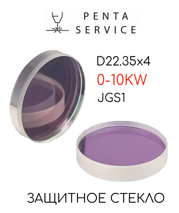Защитное стекло является плоскопараллельным окном, диаметром 22,35 мм, толщиной 4 мм, устанавливается перед линзой и служит барьером между линзой и рабочей зоной. Стабильно работает на длине волны генерации лазера 1064 - 1080 нм. Пропускная способность: 99.5%. Лучевая стойкость защитного покрытия 20 кВт/см2. Предназначено для работы с лазерами мощностью до 10 кВт.
